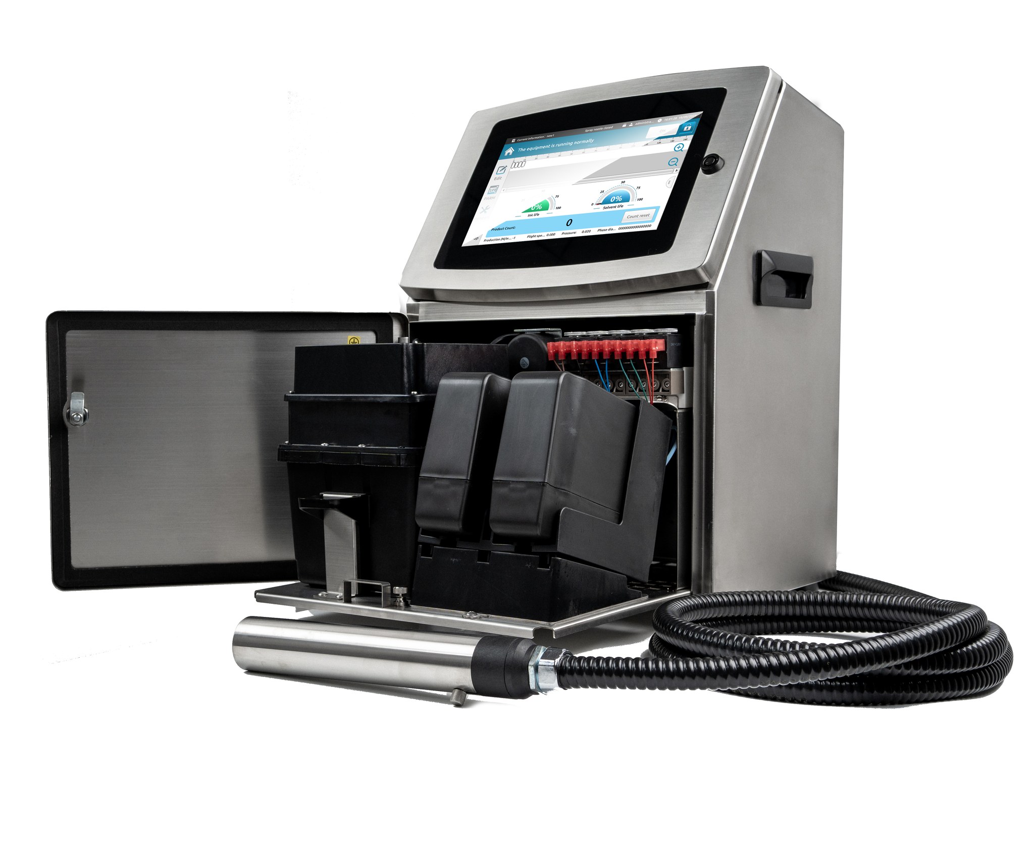 La IE-2000 es un codificador inkjet industrial de última tecnología, diseñado para líneas de producción continuas que requieren alta calidad de impresión, ahorro real y máxima estabilidad. Su sistema inteligente de optimización de consumibles reduce costos operativos y la hace compatible con consumibles no controlados, garantizando libertad y ahorro para el cliente.