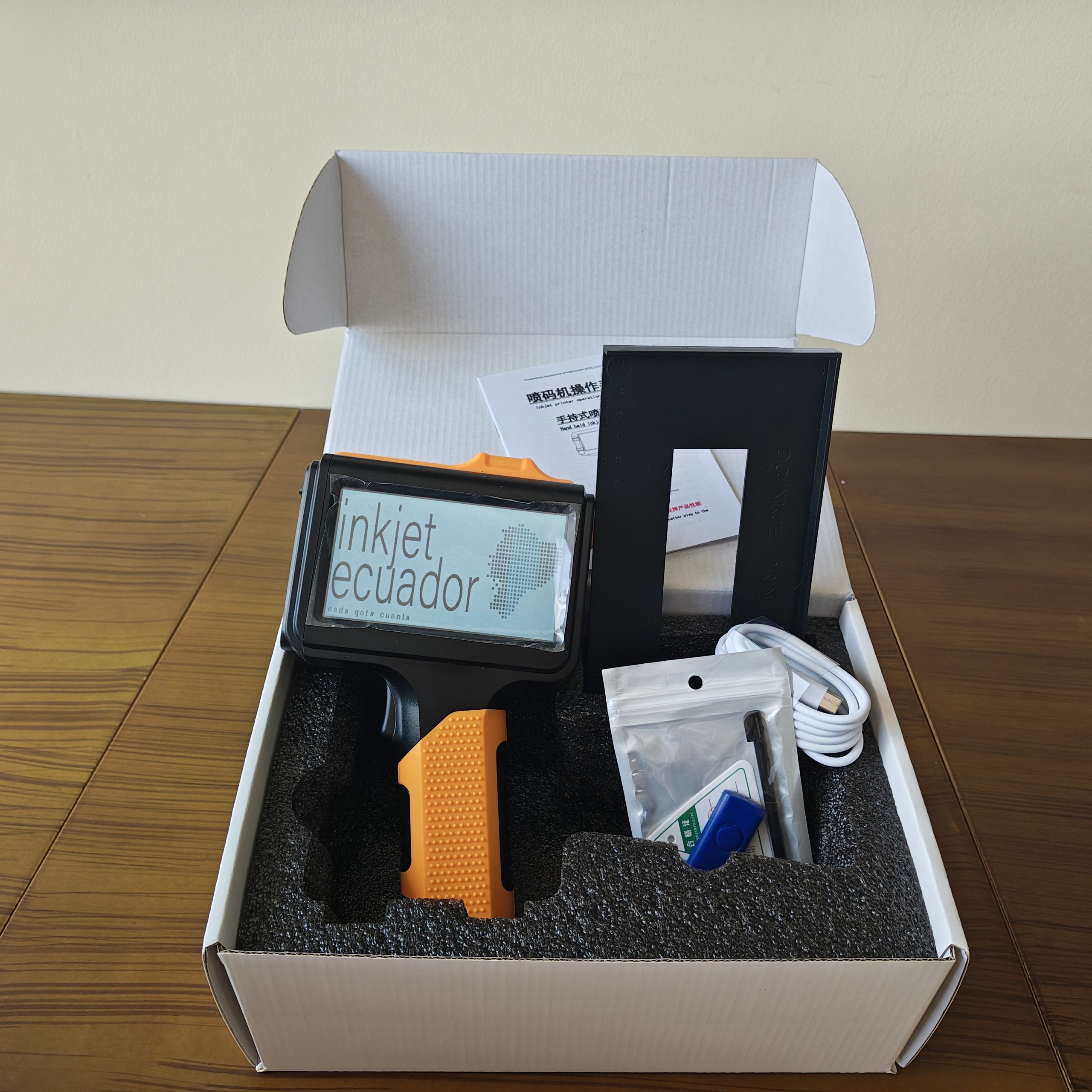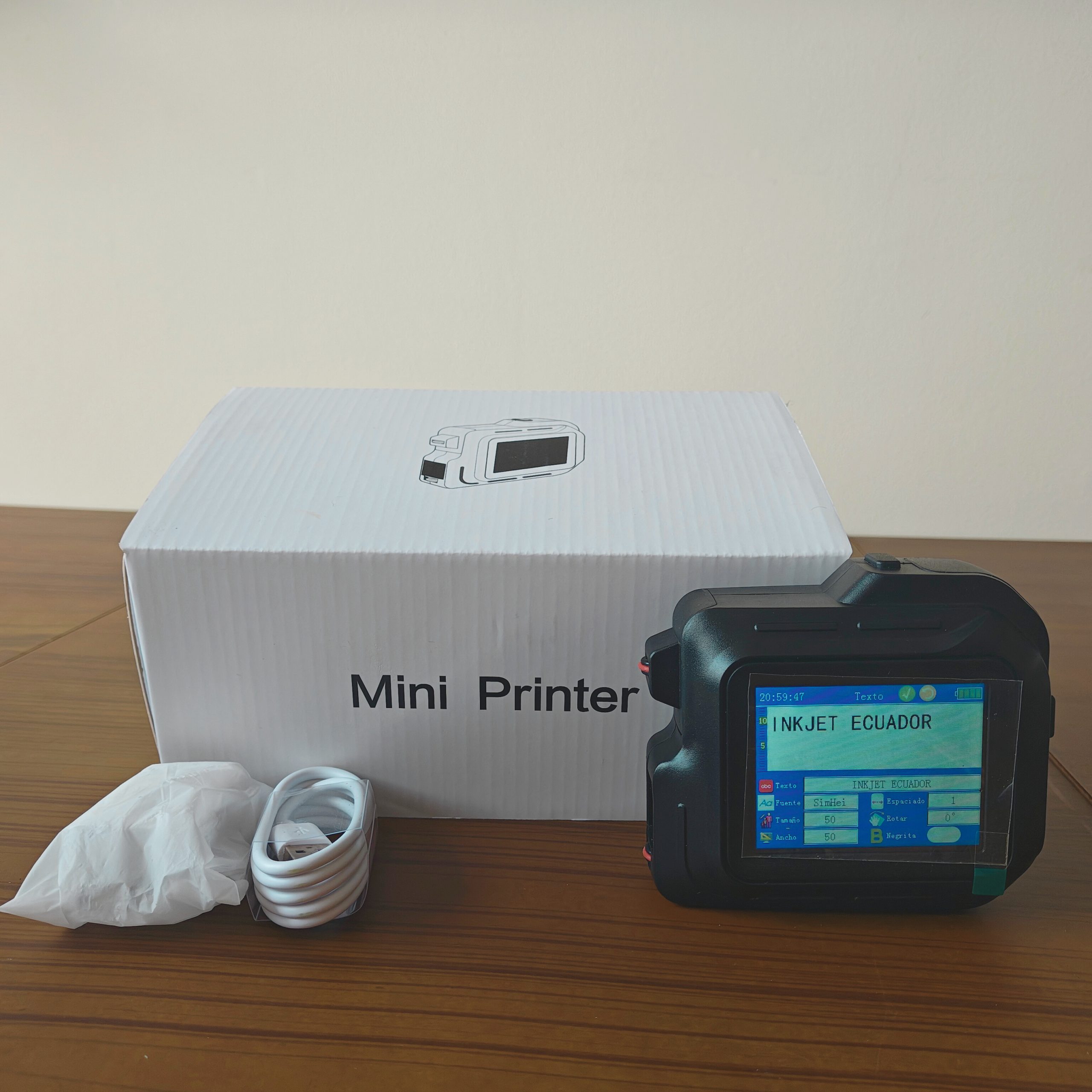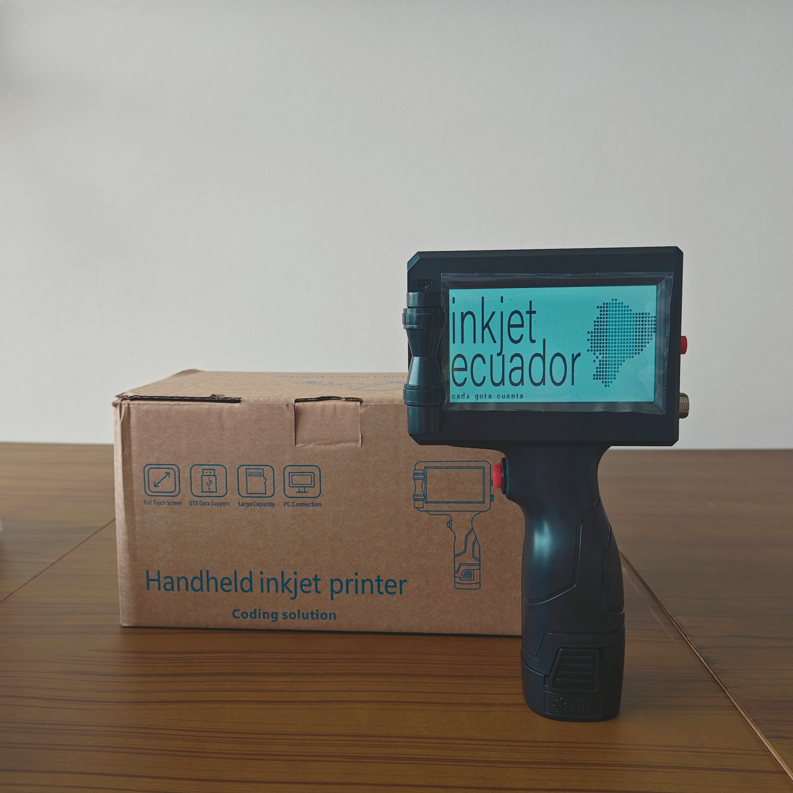 Codificadora portátil de mayor alcance, diseñada para impresiones en superficies amplias como sacos, cajas y empaques grandes. Permite imprimir textos, fechas, lotes, códigos QR, códigos de barras y logos. Incluye:
